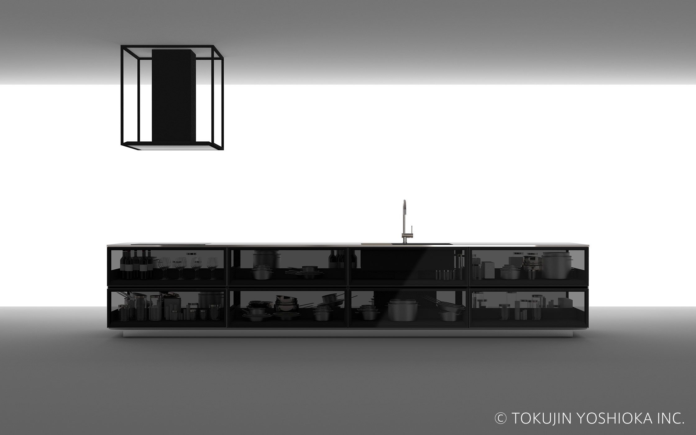 キッチングッズを収納せずに見せるように飾る「見せるキッチン」もありますが、FINESSEの場合は収納しながら調理器具などの形状の美しさをうかがえるように、キッチンパネルを透明なスモークガラスにしました。