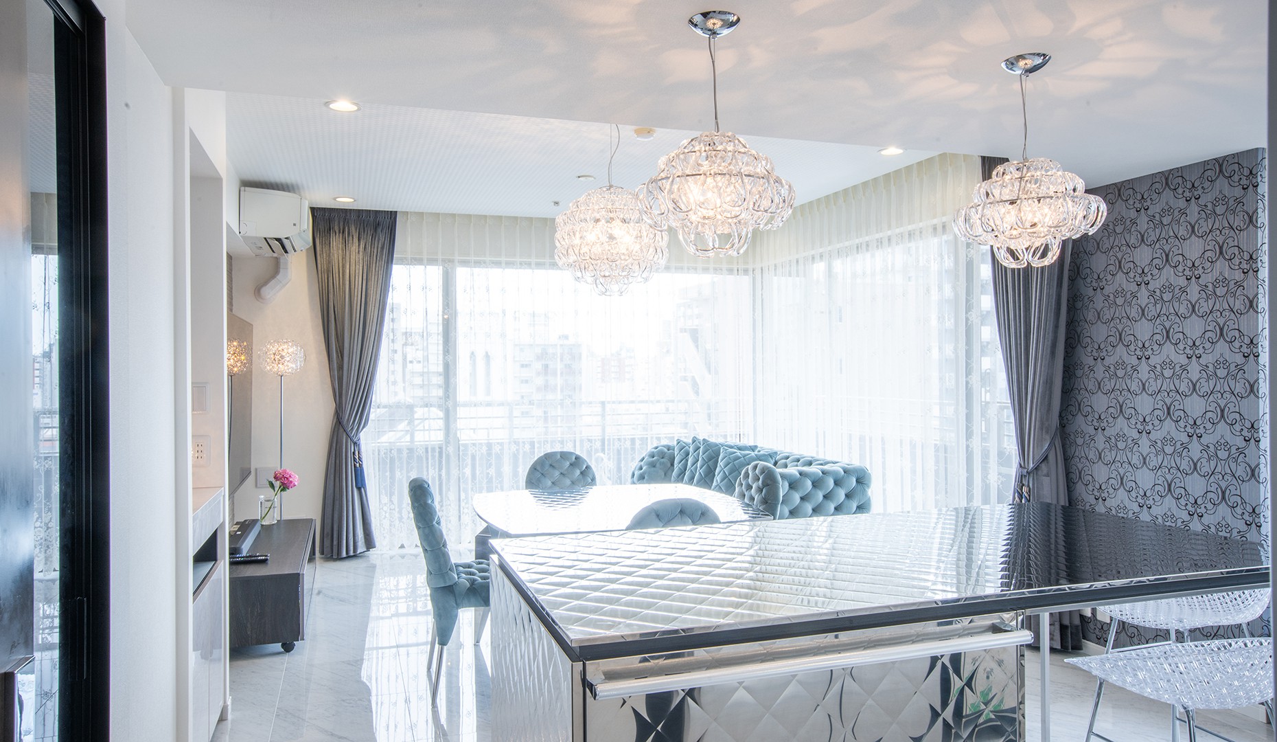 キッチンを始め、照明や家具をトーヨーキッチンスタイルでトータルコーディネートした一室空間。