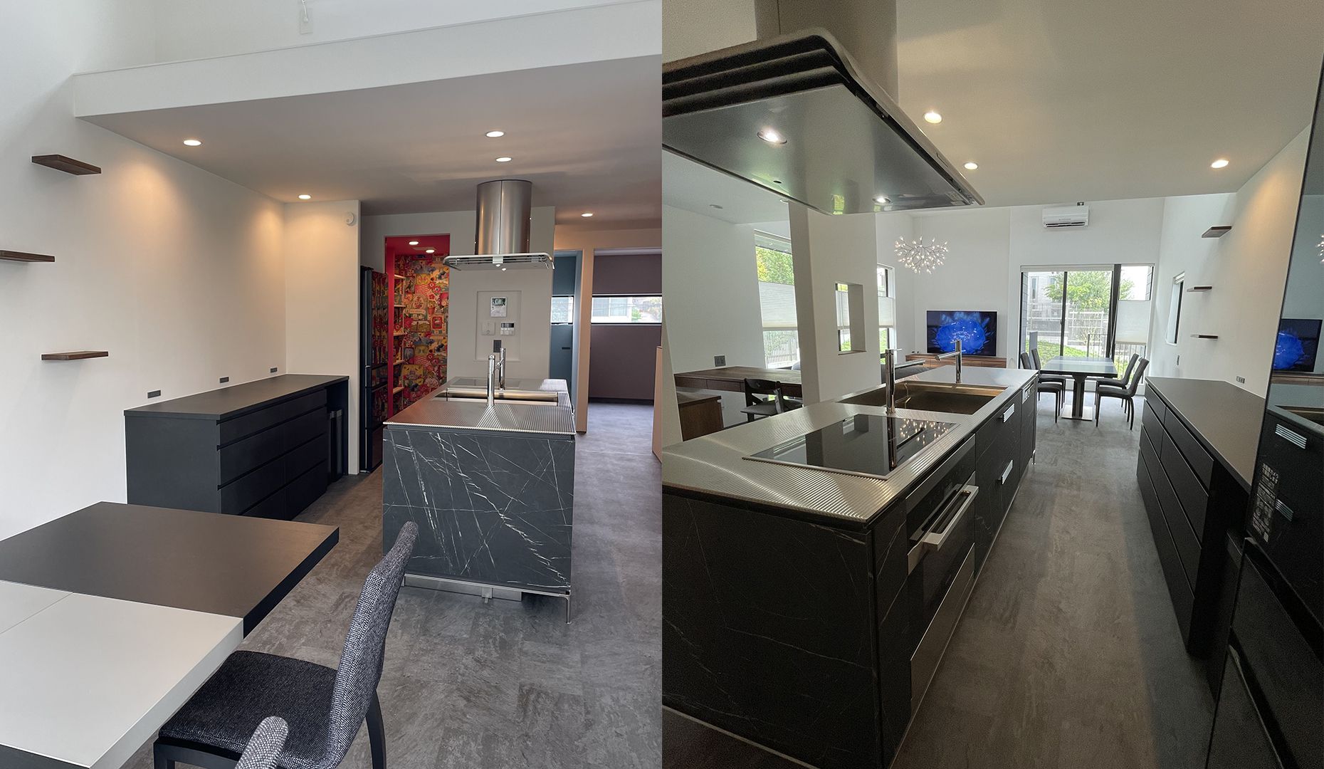 全体にモノトーンでインテリアをまとめたいというリクエストから「ブラックマーブル」の扉をチョイス。キッチンもパラレロシンクやコンパクトなゼロ動線にご興味いただき採用になりました。リニアトップもとても気に入っていらっしゃいます。