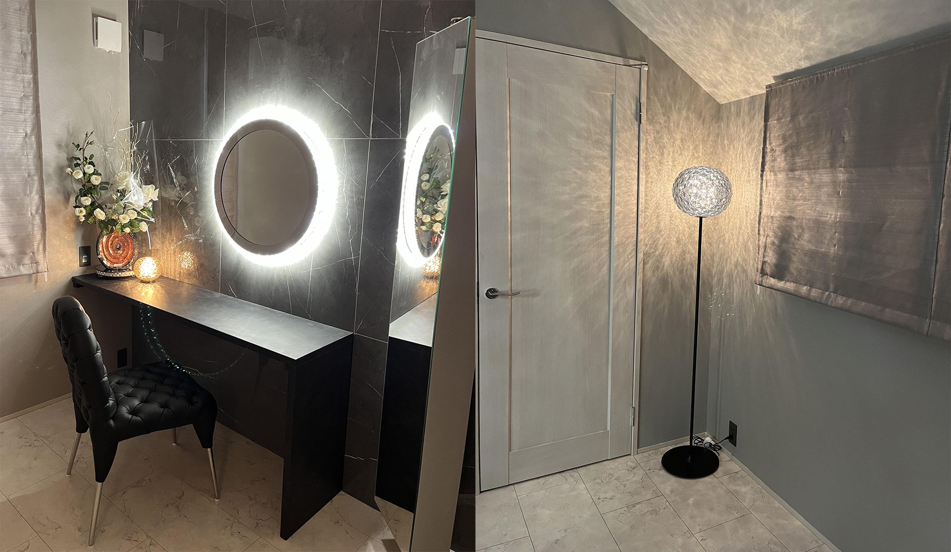 ご自身の考える心地良い空間に合う照明やミラーなどのインテリアをひとつひとつ厳選してお選びいただきました。