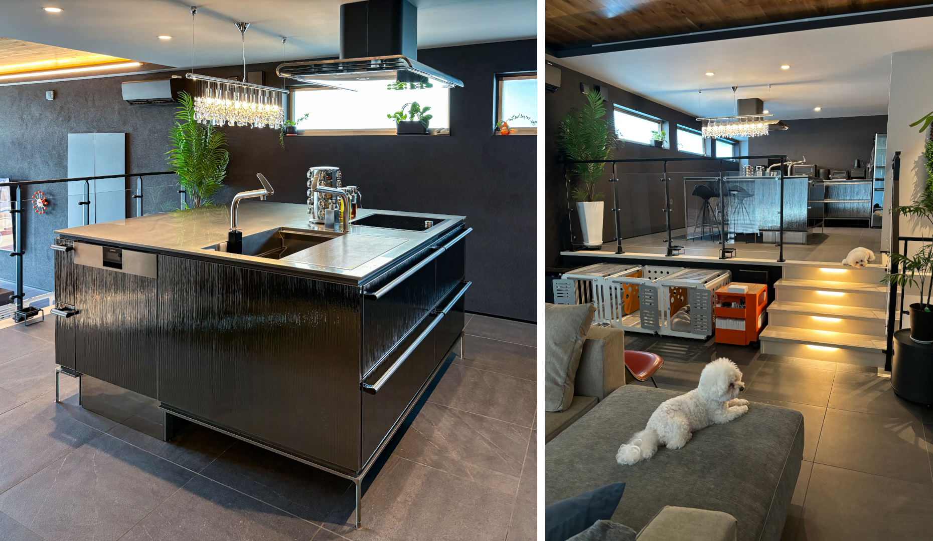 作ったお料理をそのまま配膳できるカウンター付キッチンで、時にはスキップフロアのリビングで変化する景色を眺めながらご友人を招いてのパーティも楽しまれています。