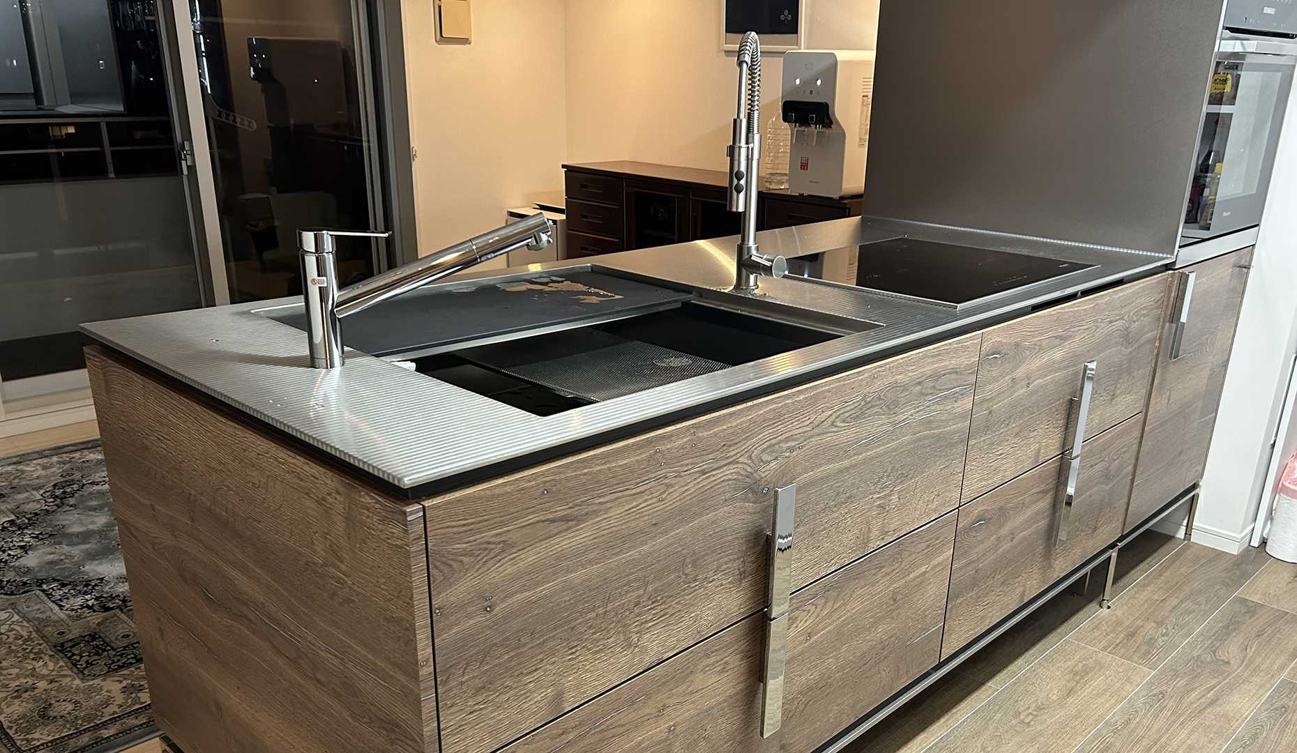 調理から収納までのゼロ動線を実現した「ゼロ動線プラス」。ゼロ動線キッチンとキッチンの加熱機器側に収納ブロックをご採用いただきました。
