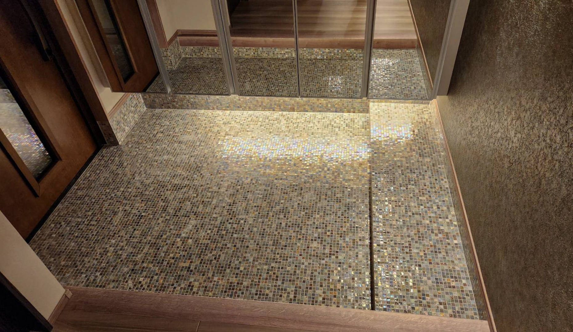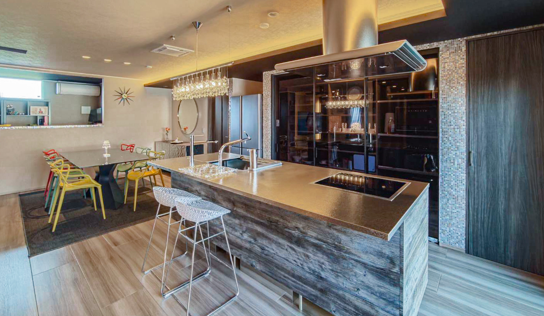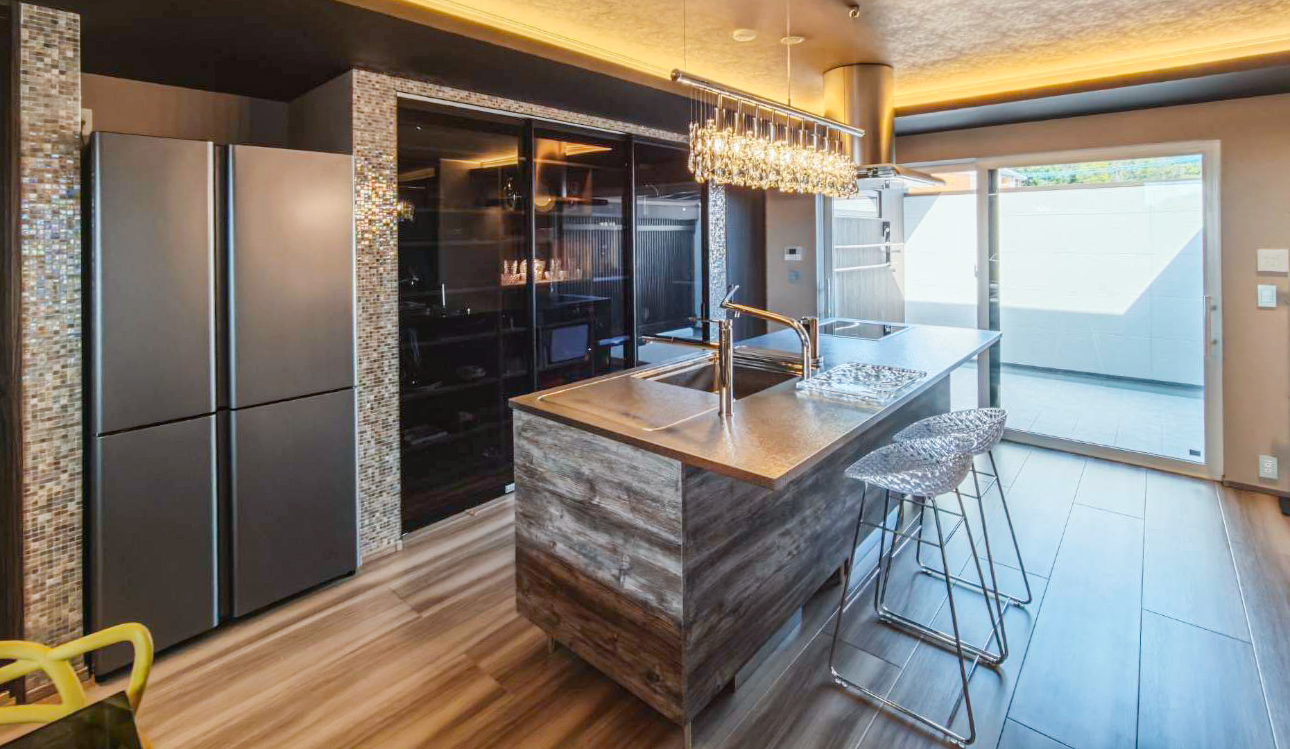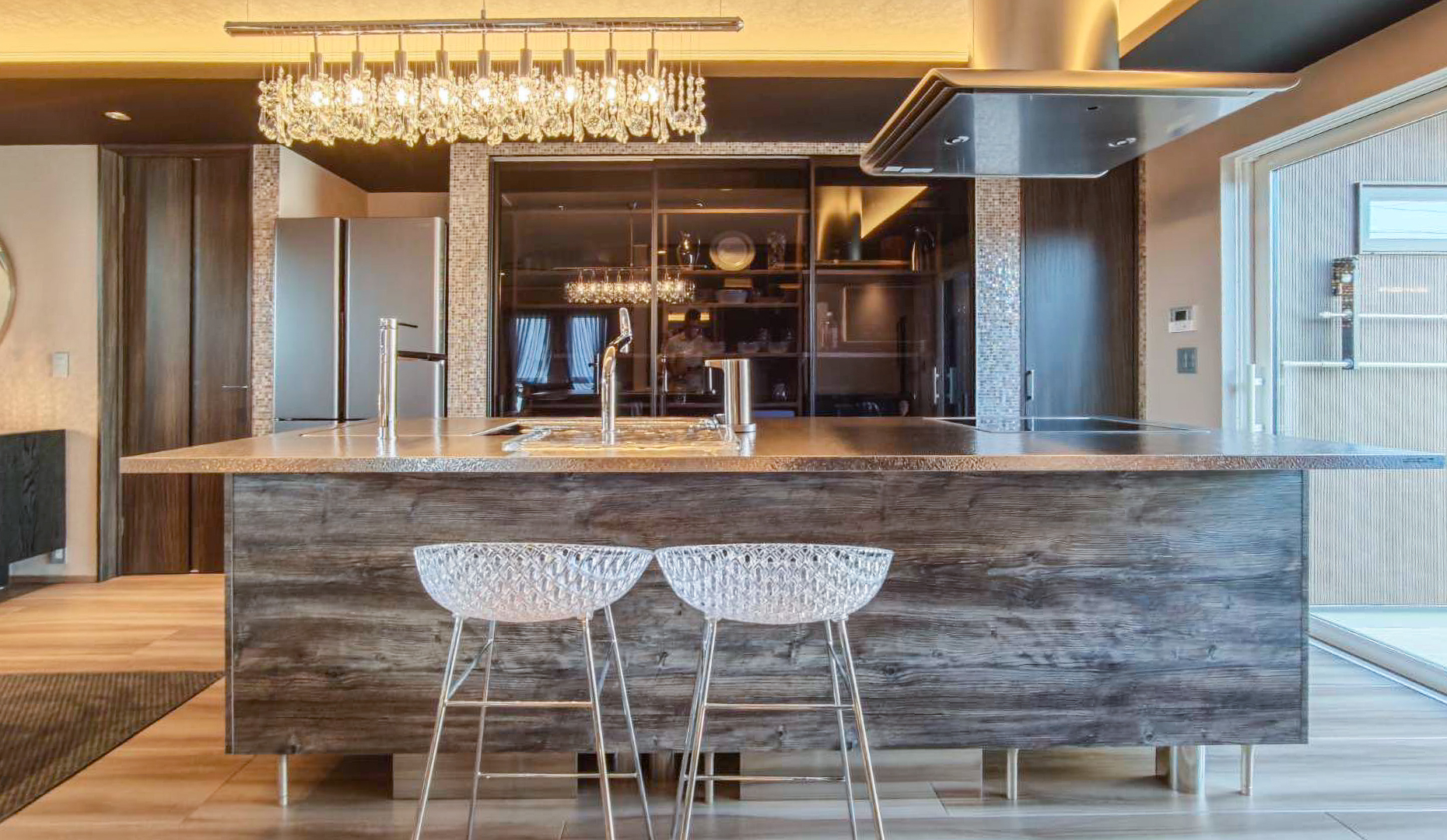 木目のキッチンに煌びやかなシャンデリアをご採用。