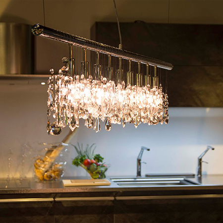 クロームメッキのパイプにきらめくさまざまな形をしたクリスタルガラスが、スマートに華やいだ空間にします。