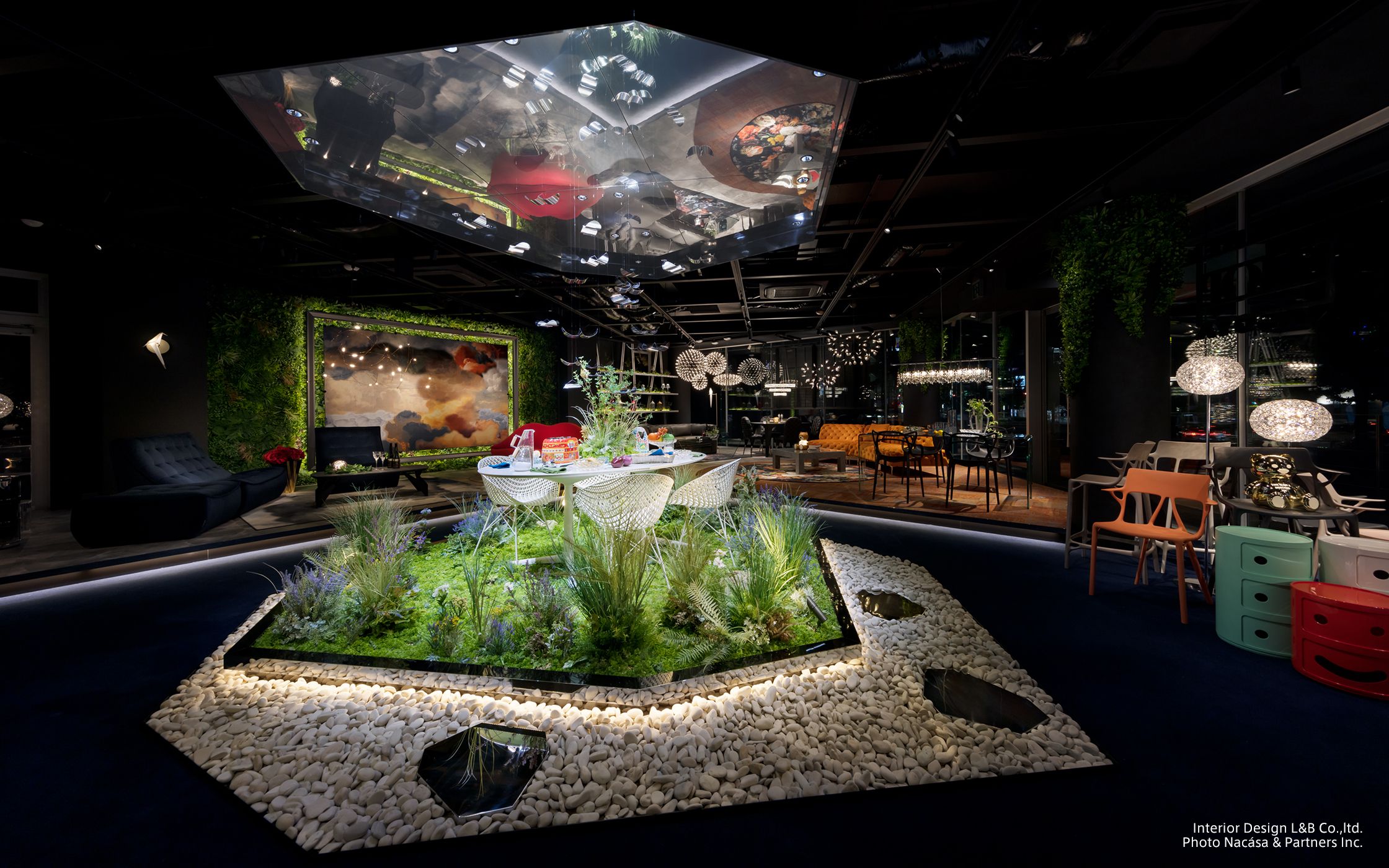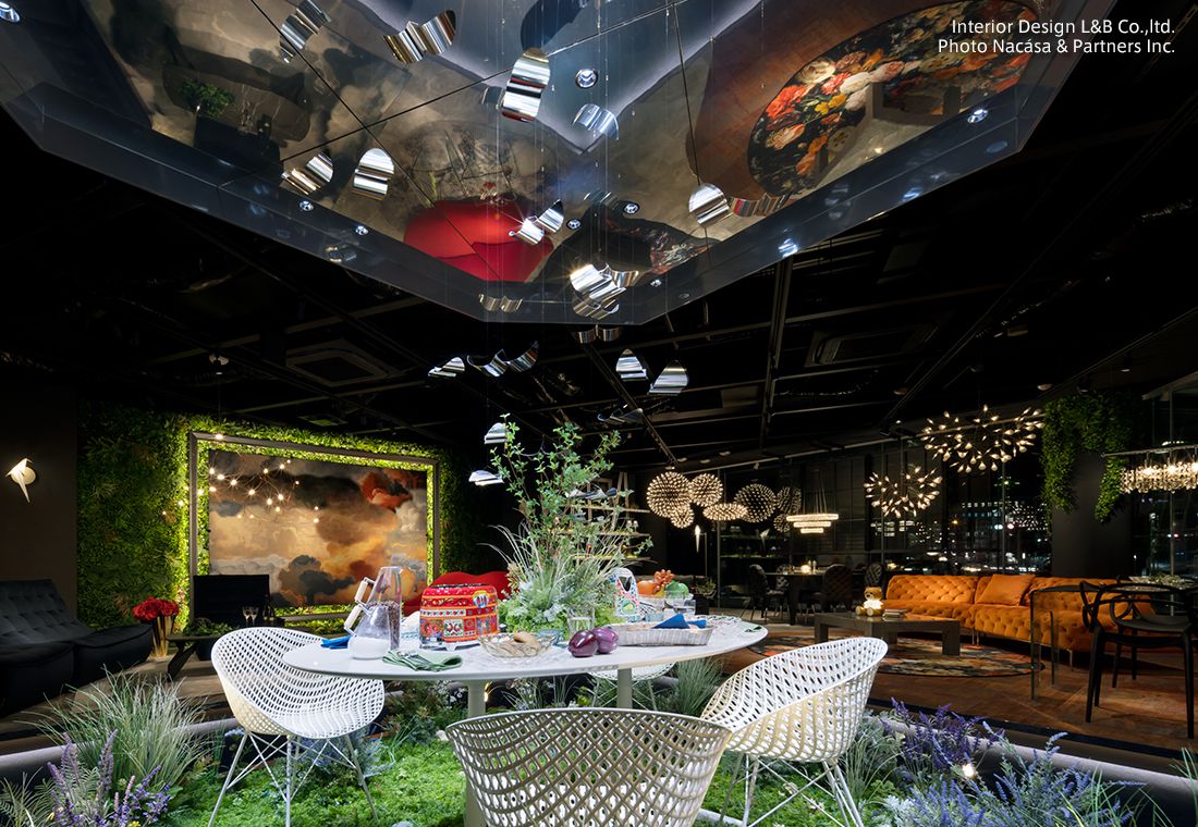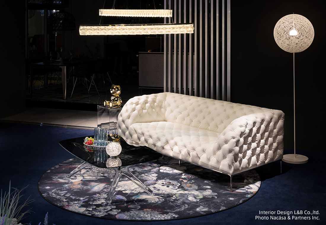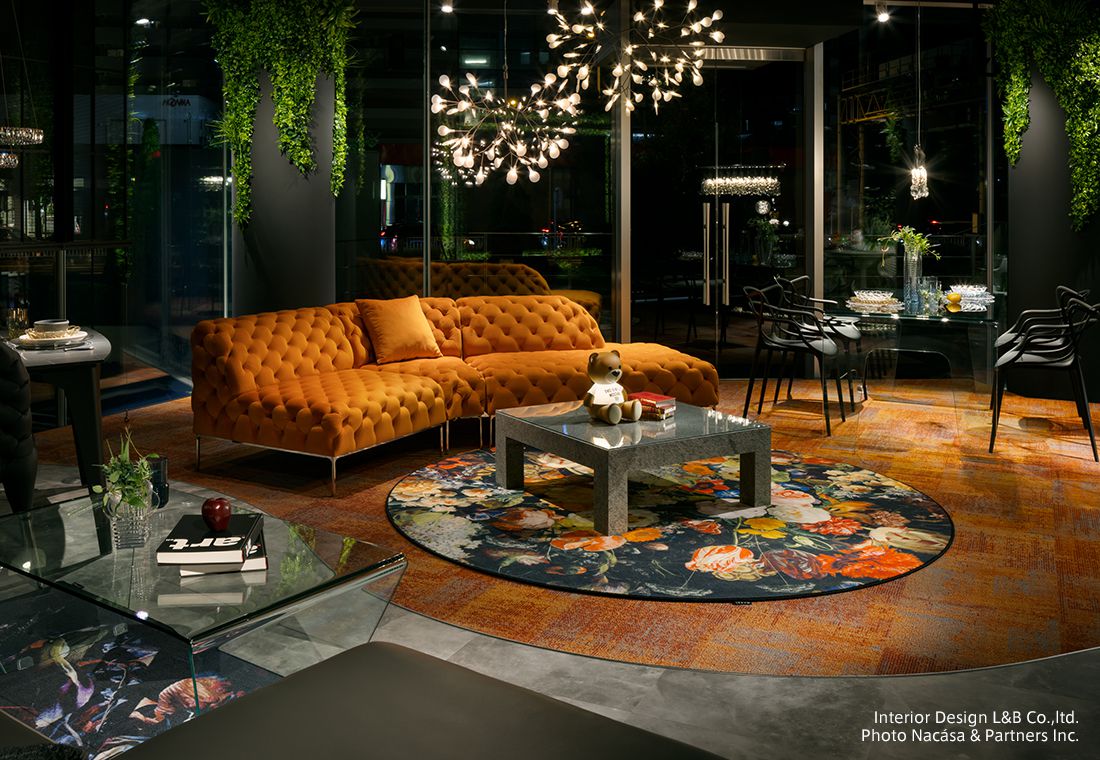 また、プロダクトの一つであるモーイカーペットを壁に飾り、まるで美しい絵画のように展示したり、3つの異なるブランド(TOYO KITCHEN STYLE、Kartell、moooi)のプロダクトを1つの空間に美しく配置し、それぞれのプロダクトの特性に合わせて照明もデザインされています。