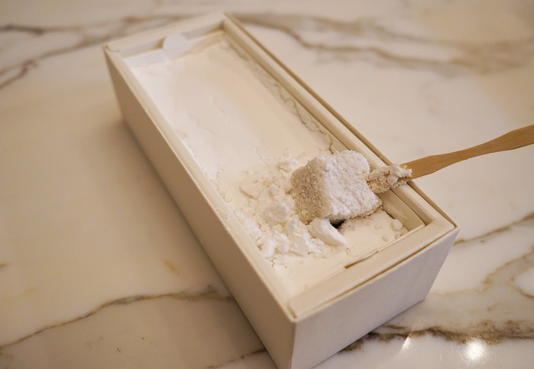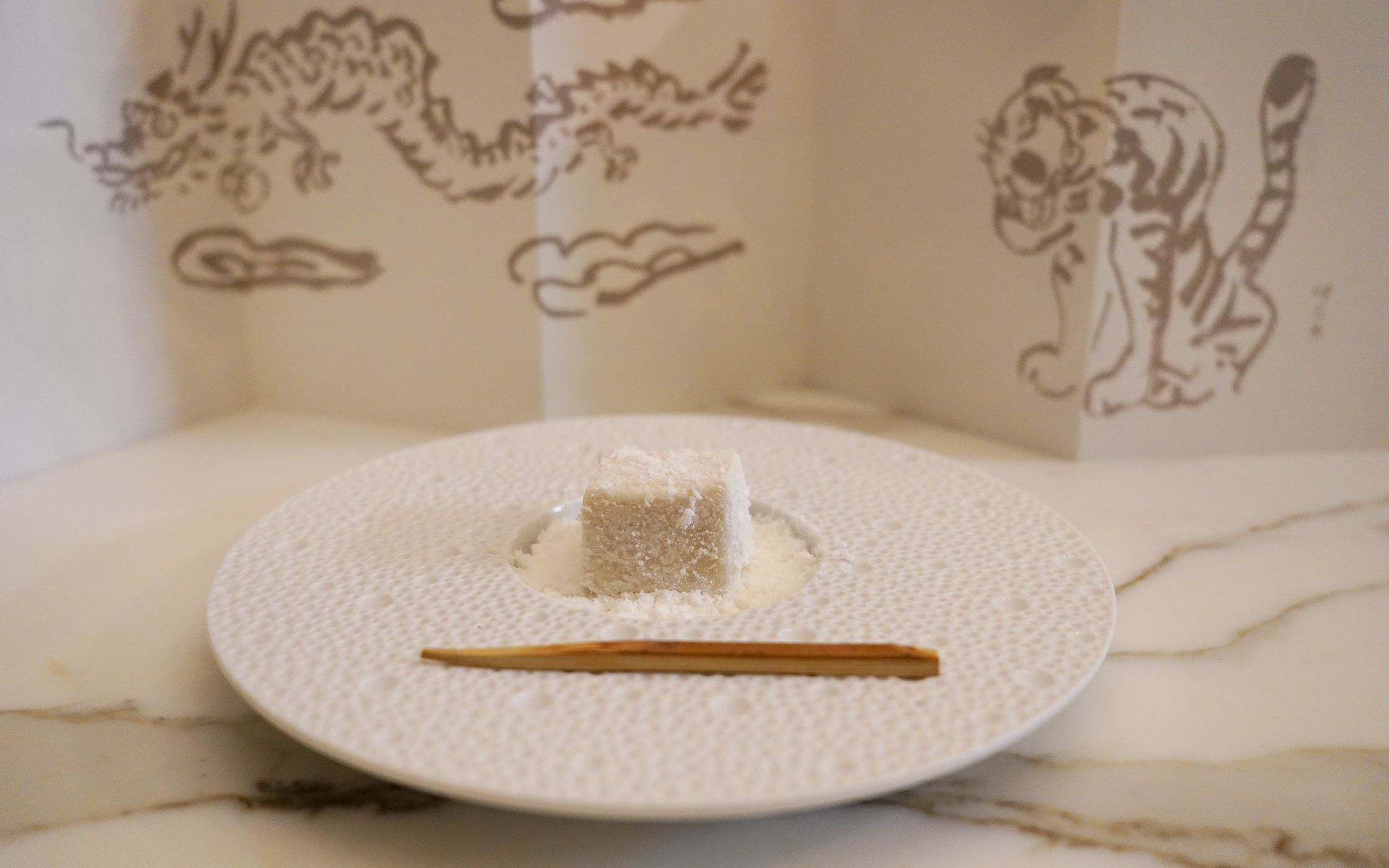 その看板商品である「椰子の白わらび餅」は、わらび粉とココナッツミルクを練りあげたお菓子。わらび粉とココナッツという異色の組み合わせを、日本料理の練りものの技法でもちもちの食感に仕立てた、他にはない逸品です。冷蔵庫で一晩冷やすと風味の変化が楽しめるのも嬉しいポイント。