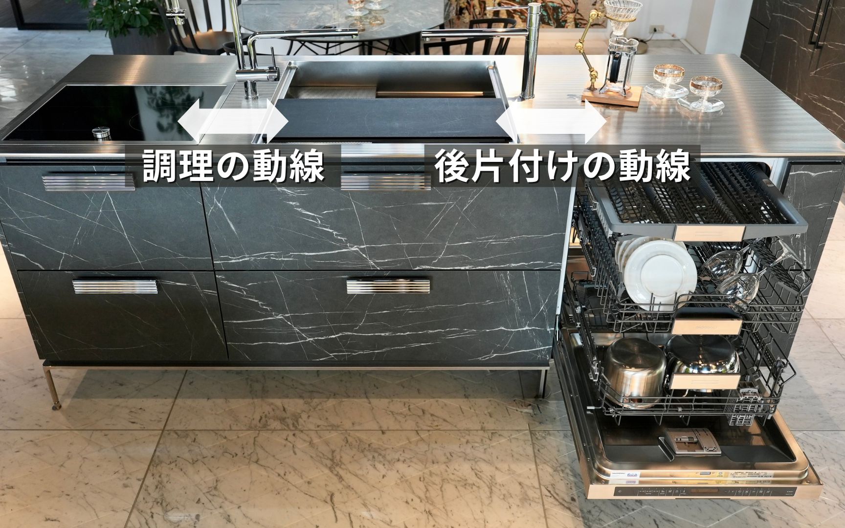 調理の動線と後片付けの動線を重ならないように食洗機をレイアウトをすることで、快適なキッチン作業が行えます。