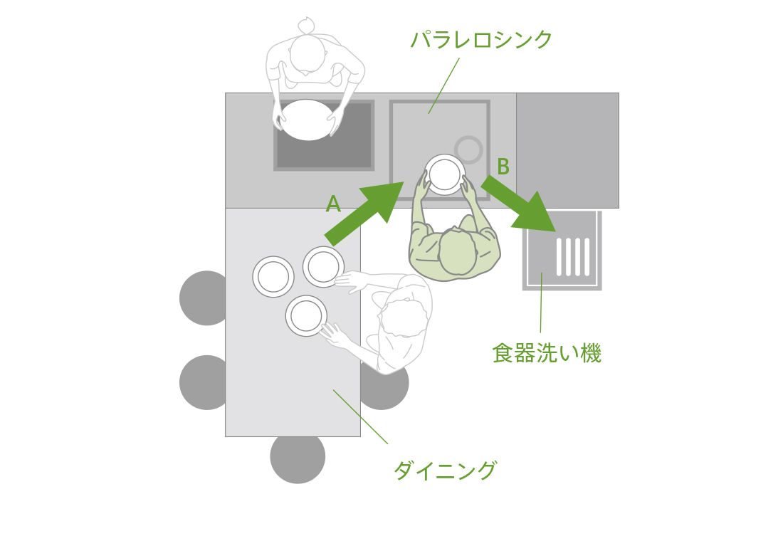 左:一歩も動かず調理ができる「ゼロ動線キッチン」。