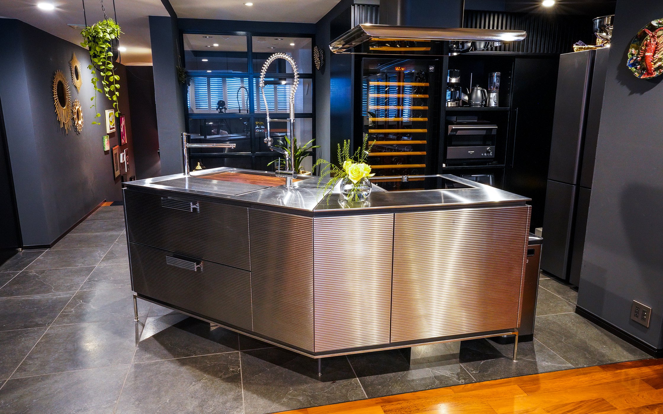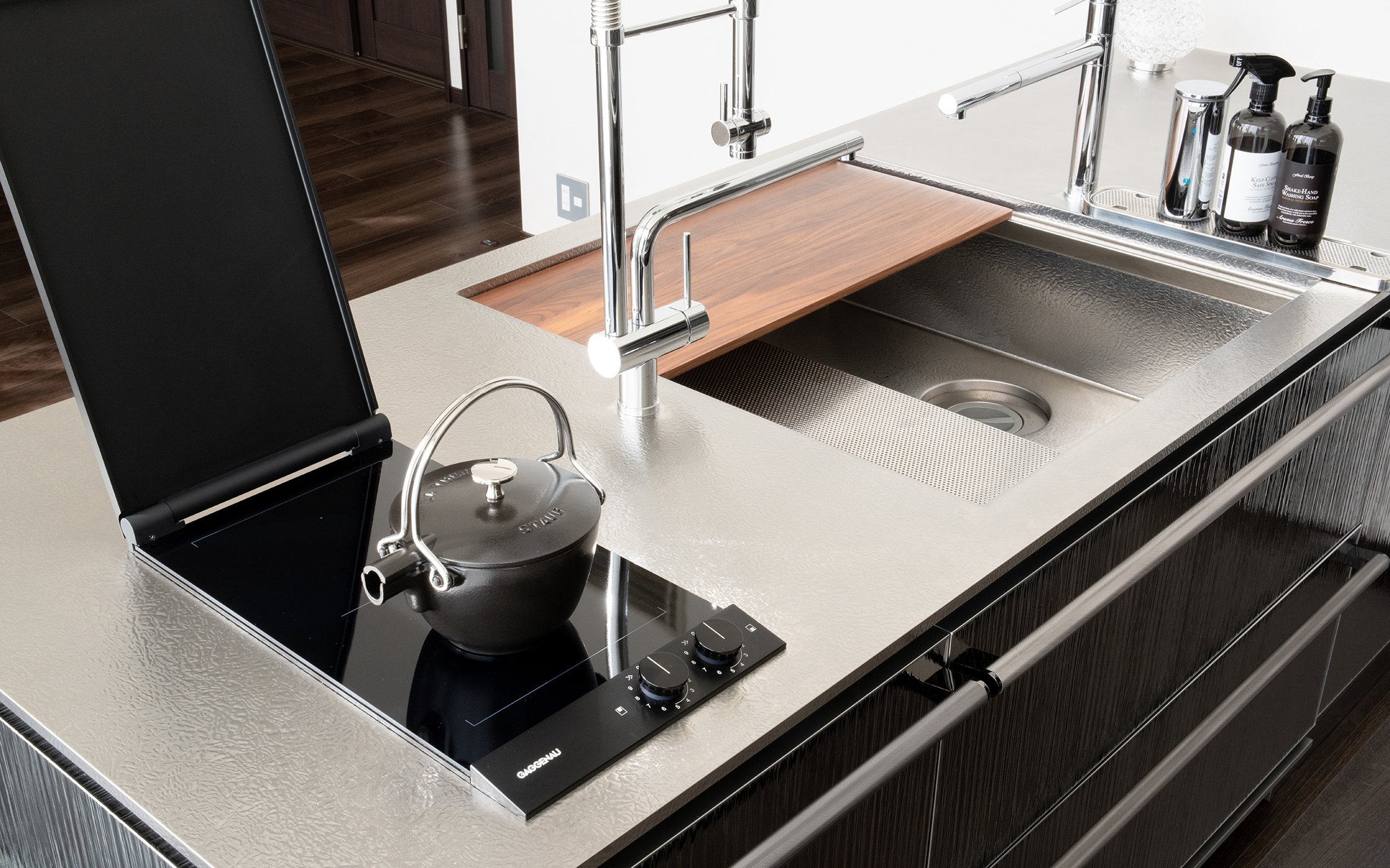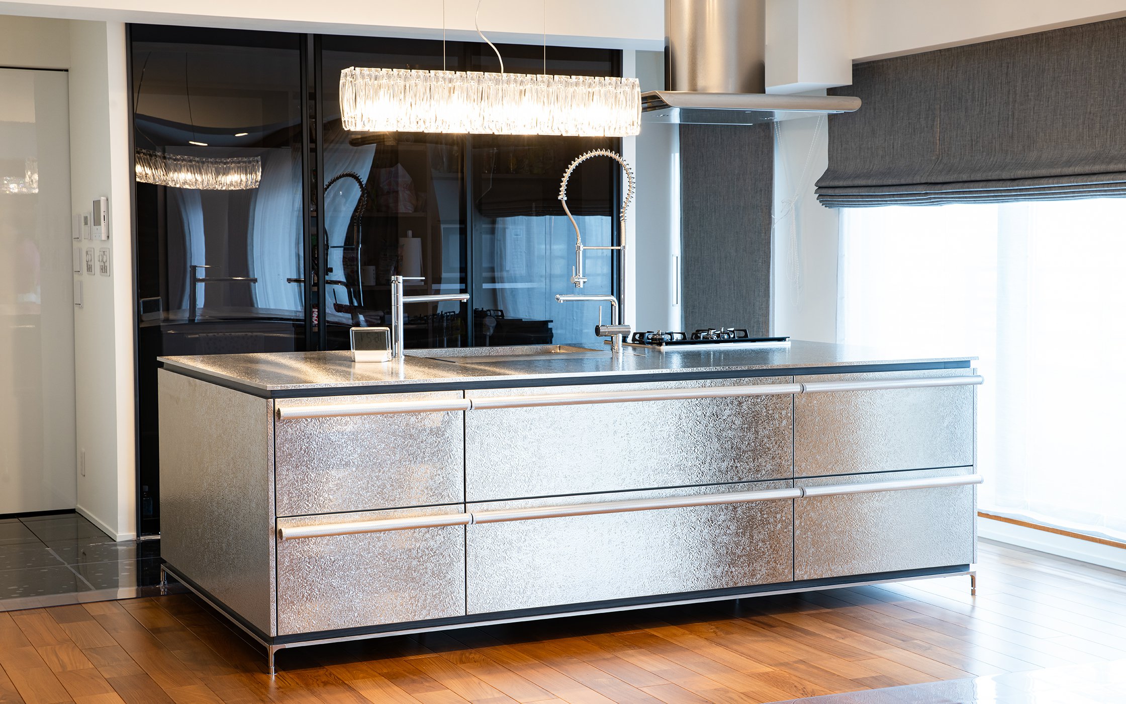 チタン研磨仕上げをはじめ、アイスやキルト、リニアといった独自の仕上げを用いたステンレスキッチンも人気です。