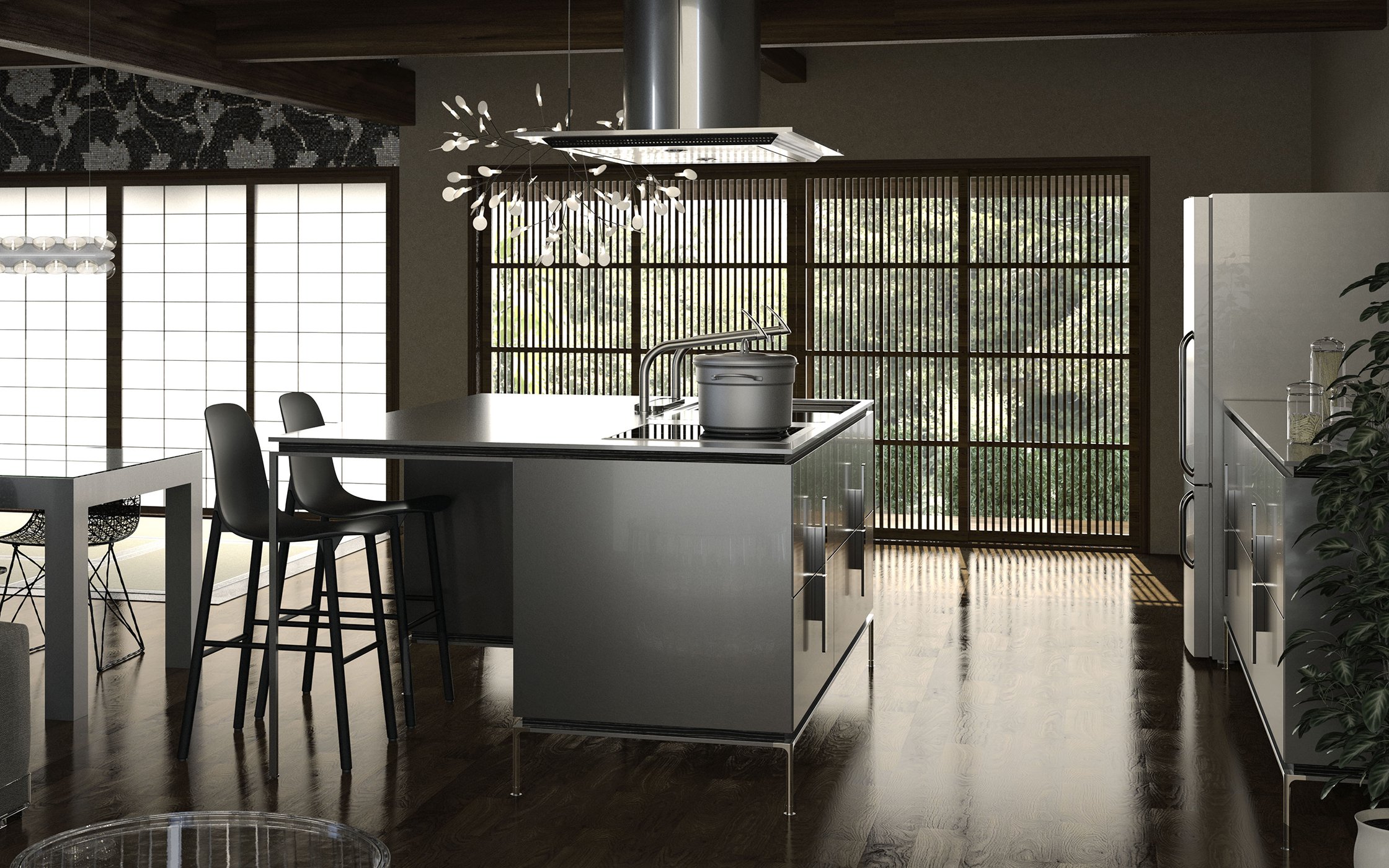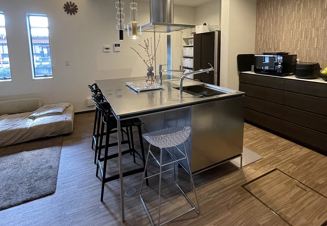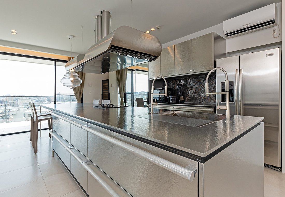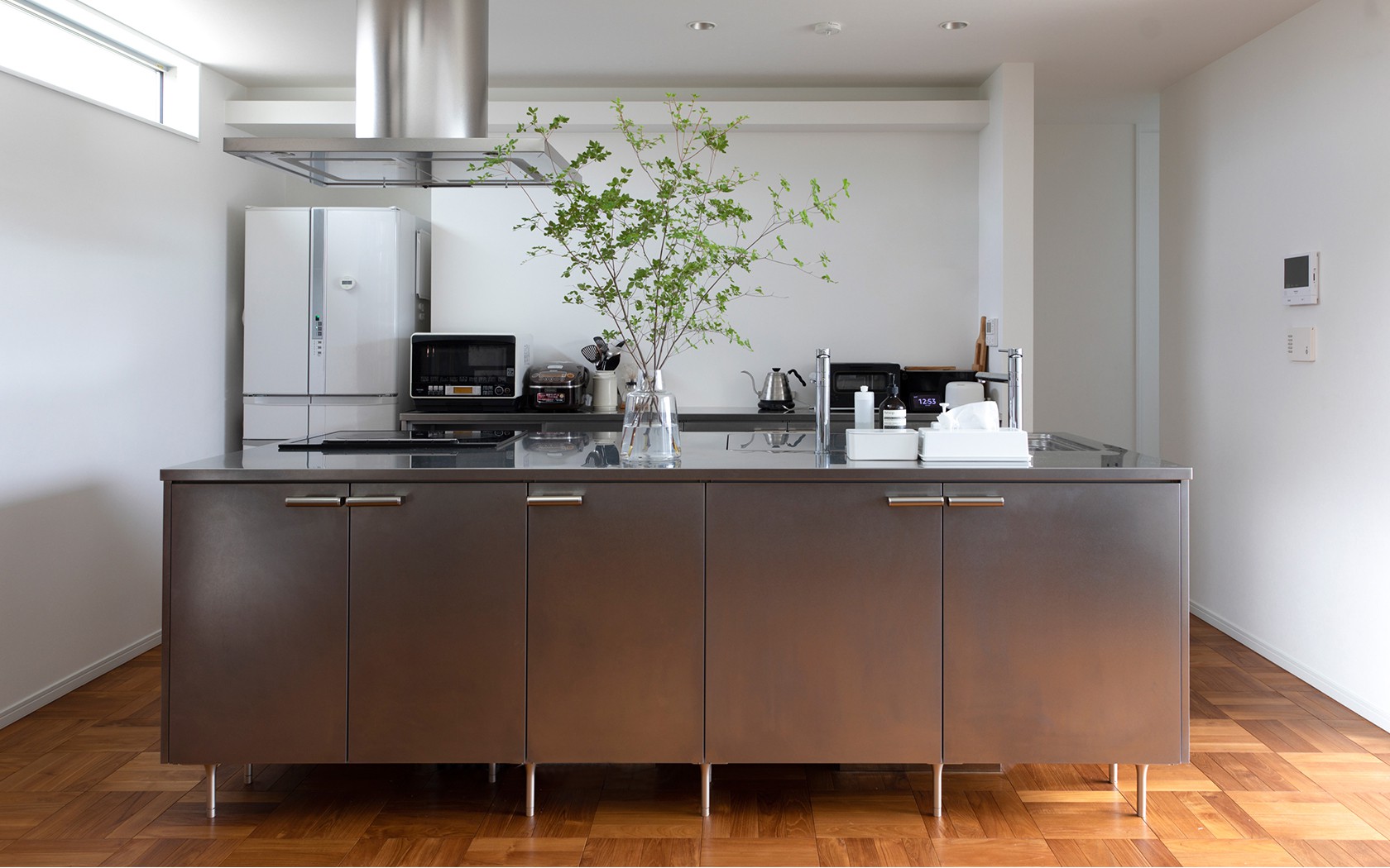 チタン研磨仕上げのステンレスキッチンは、シンプルゆえに様々なインテリアにマッチします。ナチュラル、モダン、和などを基調とした多種多様なインテリアに調和をしながらも、周囲の内装や家具を引き立てます。