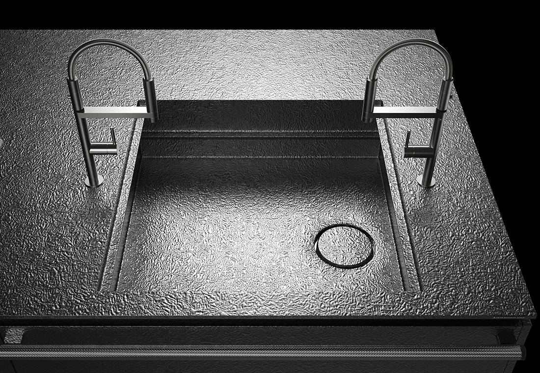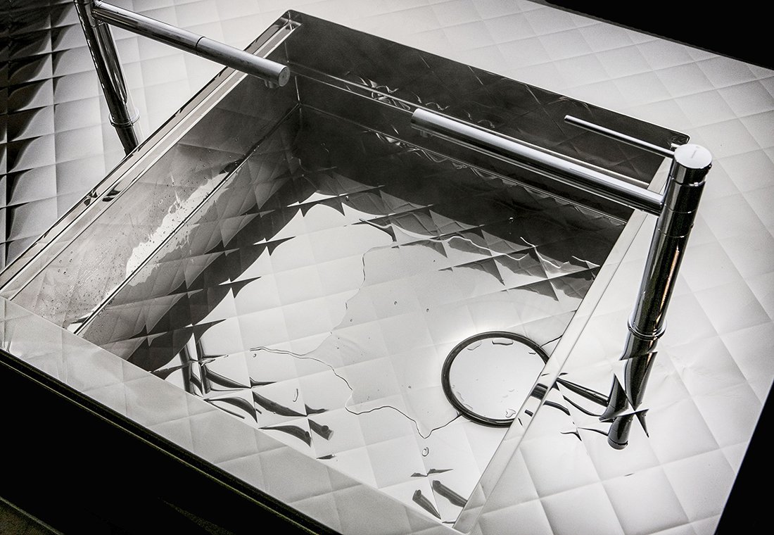 ステンレスを鏡のように研磨することで滑らかな水流を生み出し、キルティング状に溝を走らせた特殊プレスによって、水が逃げるように排水に吸い込まれるシンクです。
