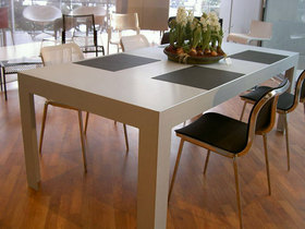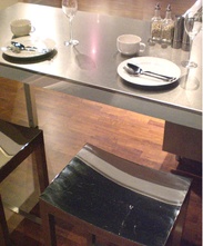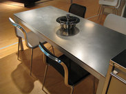 アルミのテーブルと言われると無機質なイメージが…ところがこのテーブルは違います。木目を思わせる柄はアルミインゴットから板として切り出す時に発生するテクスチャー。この表面の味わいに着目し、デザインとして取り入れています。アルミファニチャーのトップメーカー“YCAMI”ならではの作品です。一枚板のアルミは、ランチョンマット、ディスプレイをすることにより、よい引き立て役にも早変わり。ここまで存在感を放つダイニングテーブルはなかなかありません。