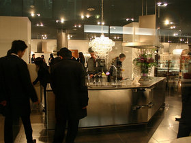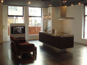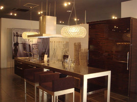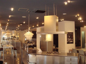 今話題のアイランドキッチンを中心に、家具・シャンデリアなどをトータルに展示。広々としたオープンな空間に宝石のようにキッチンがちりばめられています。