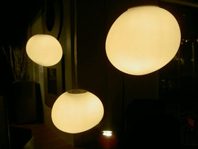 熟練の職人がフリーブローすることで完成させた作品。一つ一つに職人の丹精が込められていて、やわらかい光を放ちます。二つ三つと段差をつけて吊ることにより、表情のある空間を演出します。