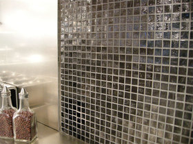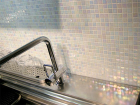 ベネツィアンガラスのモザイクタイルは、べネツィアの工房で製作されており、一枚一枚が宝石のように輝く装飾材です。キッチンだけでなく壁面や床などに用いると装飾性豊かなインテリア空間が生まれます。