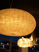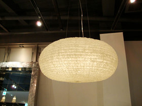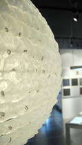 シェードは、花びら型の小さなすりガラス製で、3550個のパーツで構成されています。消燈時もインテリアオブジェとしての存在感があり、点燈時には青空に浮かぶ白い雲のようなやわらかで暖かい光を透過します。
