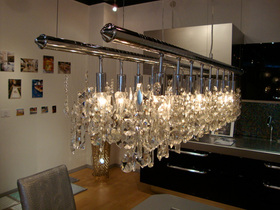 大好評のモダンスタイルのシャンデリア。クロームメッキのパイプにきらめくさまざまな形をしたクリスタルガラスが、スマートに華やいだ空間にします。2台を同時に並べたり、設置方法もデザインできます。