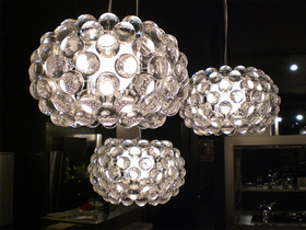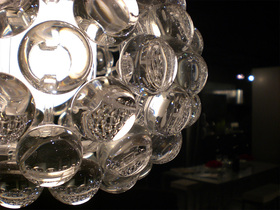 パトリシア・ウルキオラによる照明。セードに大粒(直径40ミリ)で透明度の高いPMMA樹脂を配し、『光粒子の集合体』として空間を演出します。消燈した状態でも浮遊する泡のように美しい照明です。