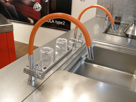 カラフルな水栓はファッション性も高く、キッチンがお部屋の中心にある今、アクセサリー感覚で選べる新しいタイプの水栓です☆スパウト部分がフレキシブルに動くため、吐水口の高さや長さを自分好みに調整できるのも便利です。