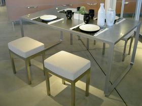 オリジナルだからこそ実現する、キッチンと同じ質感のステンレス製のテーブルやスツー