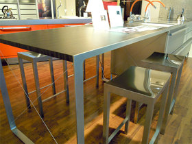 TOYO KITCHEN STYLE オリジナルテーブル。シンプルで軽やかなフレームラインのステンレスタボは、キッチンと同じ質感のステンレス製のため、キッチンの存在感を邪魔せずに、空間に一体感を生み出します。キッチンを主役とした空間にコミュニケーションの場をプラスするキッチンに住むための家具。