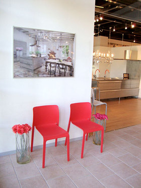 鮮やかな赤い色がショールームによく映えます。