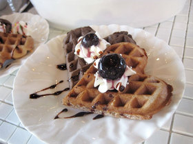 写真のワッフルは、ココア味といちごジャム味。