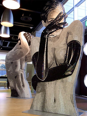 名古屋ショールームも「ベネツィアンモザイク展」としてエキシビション会場となっています。現在、正面玄関では、写真のような迫力満点のアートタイルの展示が出迎えてくれます!