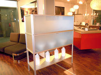 ほんのりと中身が見える乳白色のガラス扉の棚は、後ろ姿もスタイリッシュ。オープンな足下が軽やかです。扉は手前に開くフラップ式です。
