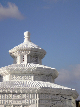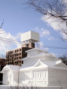 ショールーム目の前の雪像は京都三名閣のひとつ、国宝「西本願寺・飛雲閣」