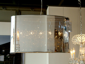 円柱型シェードに、様々な形のクリスタルガラスがちりばめられているペンダント照明。