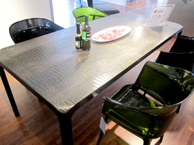 コーナーに滑らかなアール形状が施されているため、2000mmの大きな間口も不思議と圧迫感がありません。天板のクロコダイル柄がダイニングのアクセントとして際立ちます。