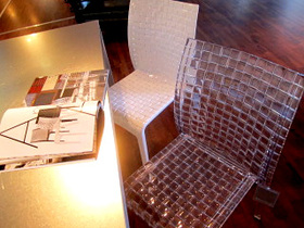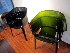 透明のポリカーボネートで造られた丸みのある包み込むような背もたれのアームチェア。