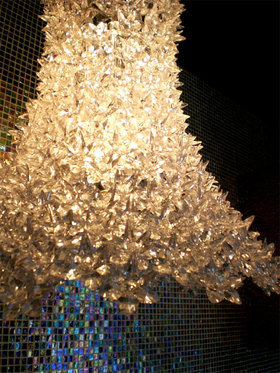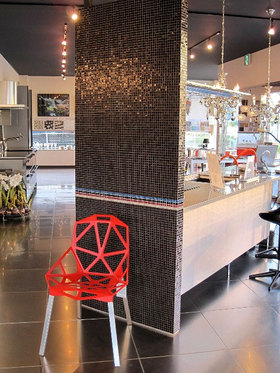 ガラスのモザイクタイルでしか表せない輝きが、透明のダイニングチェアをより引き立たせます。
