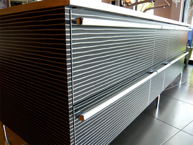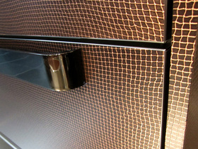 直線を主体とした空間構成と、無彩色を主体としたカラーリングというミニマルに対してのアクセントとしてこんな扉はいかがでしょうか。 HPL(ハイプレッシャーラミナート)の表面に木目をプリントしたアルミを圧着して同時成形するという、まったく新しい扉素材です。 木目のカラーリングも普通の茶系の木目色ではなく、グリーンの木目を使った個性的なドアカラーに仕上がりました。