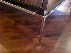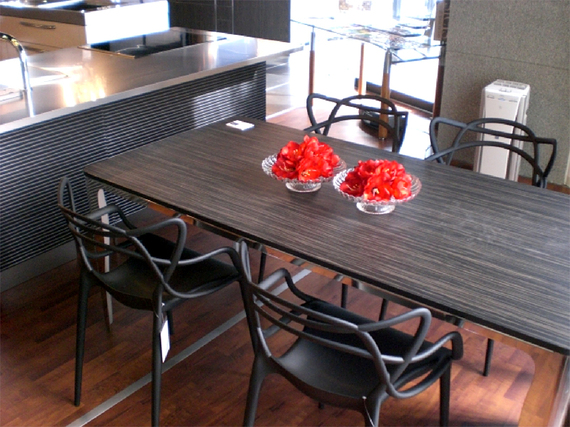 柔らかく落ち着いた風合いのブラックゼブラの天板に、アンティーク家具のような流れる曲線が美しいラインの脚をもつオリジナルテーブル。細いエッジとステンレス鏡面の美しさも堪能できます。