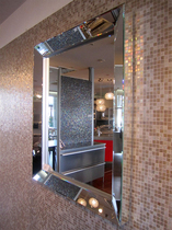一見シンプルなミラーですが、フレーム部分もミラーで構成され、正面だけでなくミラーフレームの厚みにも写り込み、ユニークで存在感のあるデザインが空間を演出します。