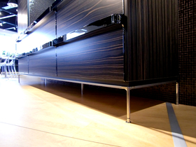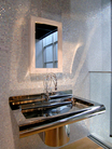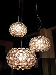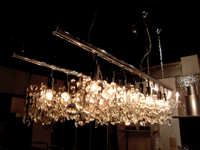 クロームメッキのパイプにきらめくさまざまな形をしたクリスタルガラスが、スマートに華やいだ空間にします。