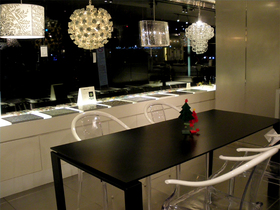 シャンデリアだけでショールームを灯し、幻想的な雰囲気を味わえます。その中で見るベネツィアンモザイク・家具はいつもとはまたちがう顔を見せます。