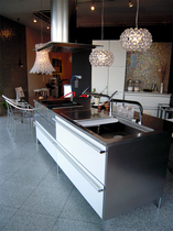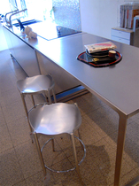 天板の仕上げは、キッチンとお揃いのチタン研磨仕上げ。ダイニングテーブルとして、作業台として、マルチにお使いいただけます。