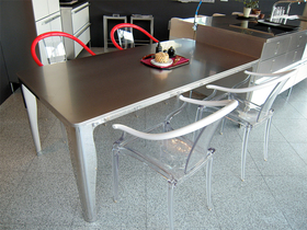 曲線的な脚元が美しい、人気のアトランタテーブル。ダークな木目柄の天板に加え、ステンレス天板のアトランタが新たに展示されました。
