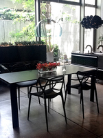 テーブルトップがとてもスリムで幾何学的デザインが特徴のテーブルに対し、先人の名作を再編集した有機的デザインのチェアをコーディネート。