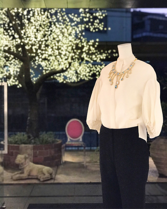 シンプルなコーディネートにSHOUROUKの煌びやかなモナコネックレスを合わせれば品格の良さが際立つパーティスタイルの出来上がりです。