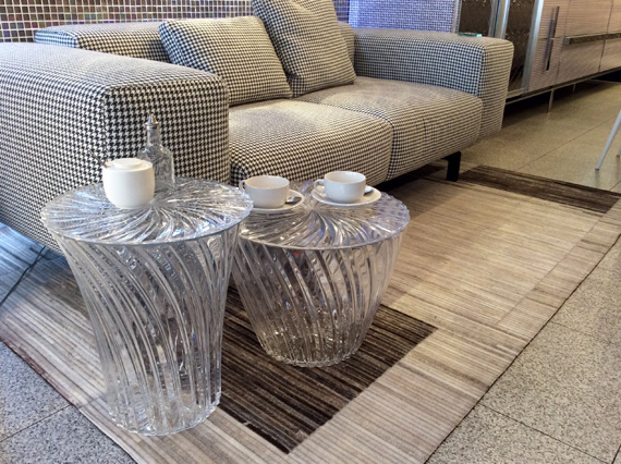 吉岡徳仁氏の得意とするクリスタルのような透明感が特徴のスツールとサイドテーブルです。