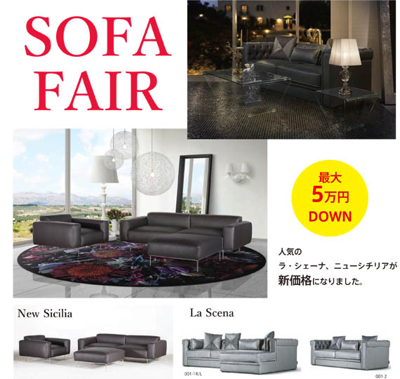 本格イタリアンレザーを贅沢に使用しながらも価格はコンパクトに抑えたソファが、さらに最大5万円DOWNという大変お得なフェアになっています!