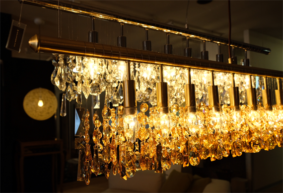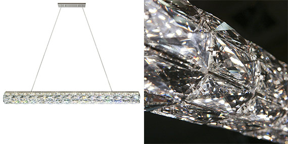 カットガラスのオーナメントが円筒状に付けられた吊り下げタイプのLED照明です。
