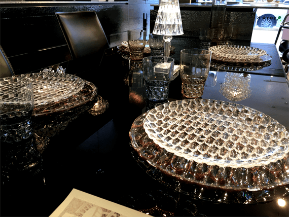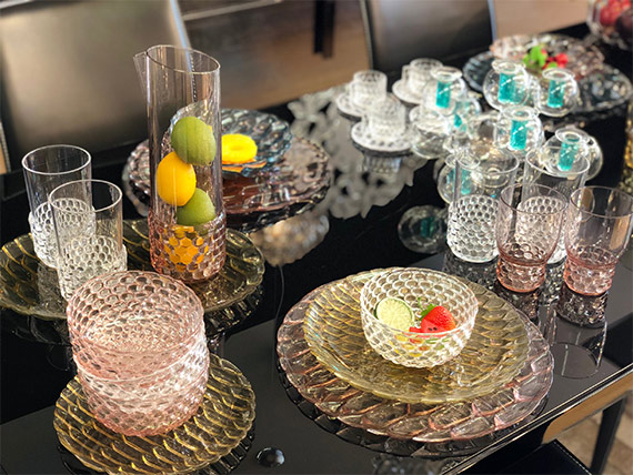 樹脂製ながらガラスのような輝きを持ち、扱いやすいカルテルのテーブルウェアとなっております。