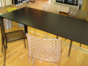 クリアな脚構造とカラフルなバリエーションを持つ天板が対になっているデザインが最大の特徴です。