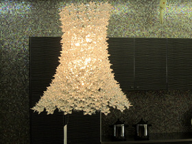 3550個の花びら型の小さなすりガラスは、青空に浮かぶ白い雲のようなやわらかで暖かい光を透過します。そしてイゾラタボの天板にも使われている人工大理石は淡雪のような白をまとう「ホワイトグラス」をコーディネート。ゼリーストーンならではの美しい透明感がより一層、パピルスを魅力的に仕上げます。