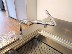 蛇口部に操作レバーがあり手元で操作可能。肘や腕でも操作ができ、手が汚れていても水栓を汚すことなく簡単に操作できます。横から見たときのフォルムが”うさぎ”そっくりなこの水栓、卯年な2011年はこれを選ぶといいことあるかも……?!